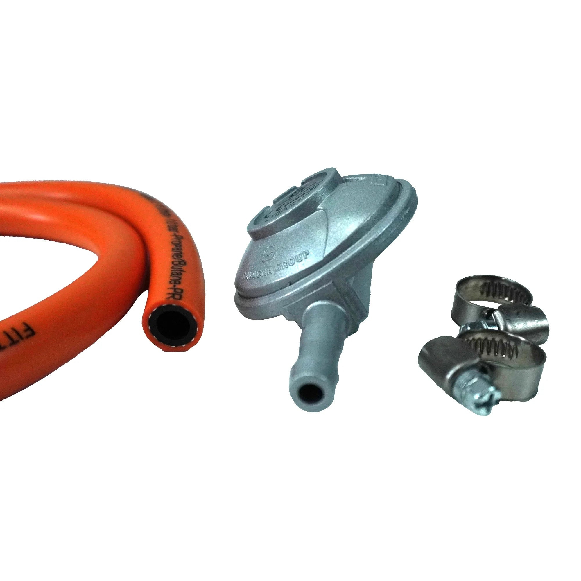 - The factory-calibrated regulator reduces gas pressure to 30 mbar for safe operation, and the kit includes a 1-meter plastic-coated rubber hose and two hose clamps for secure connections to your gas stove or portable grill.