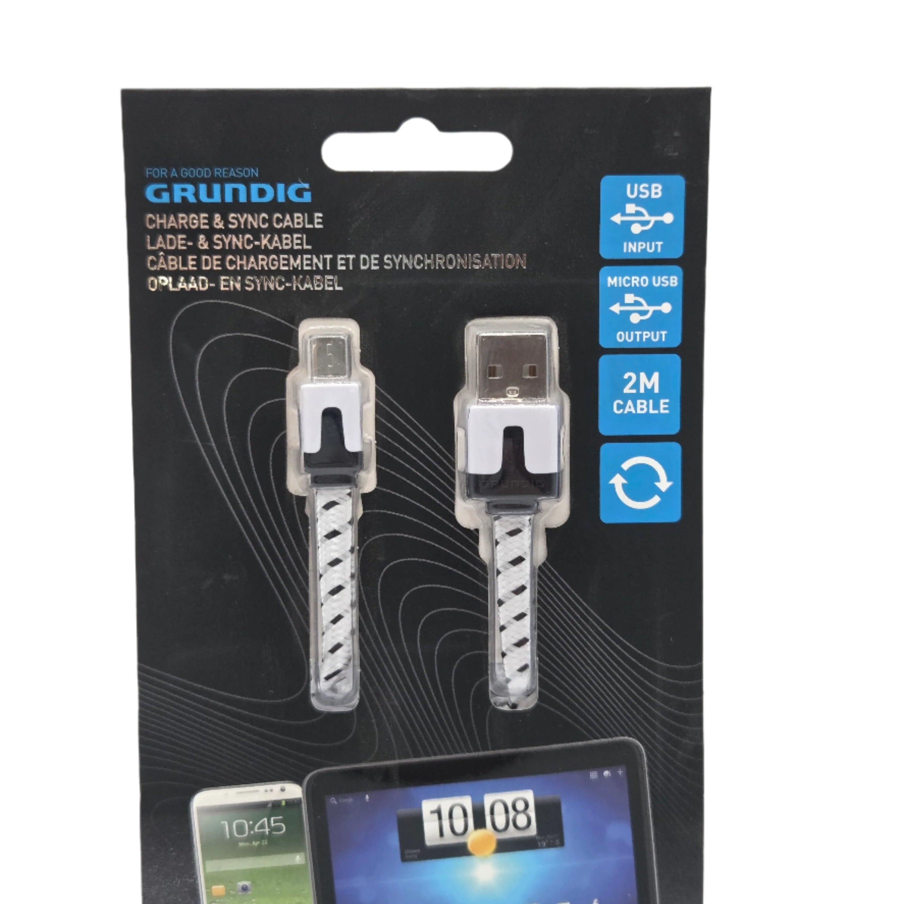 El cable Micro USB-B de Grundig, con una longitud de 2 metros y diseño en negro y blanco, es el accesorio ideal para cargar y transferir datos entre tus dispositivos con conector Micro USB. Su longitud superior a la estándar te ofrece mayor libertad de movimiento, facilitando el uso de tu smartphone, tablet, altavoz Bluetooth, auriculares inalámbricos, lector de libros electrónicos y otros equipos compatibles, ya sea en casa, en la oficina o durante tus viajes en coche.