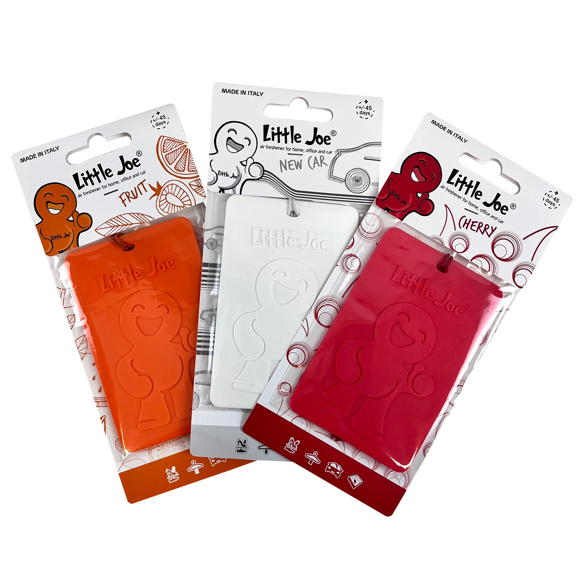 • Disponibile in tre profumazioni: ciliegia, nuova auto, frutti.